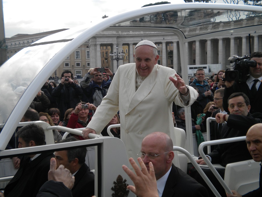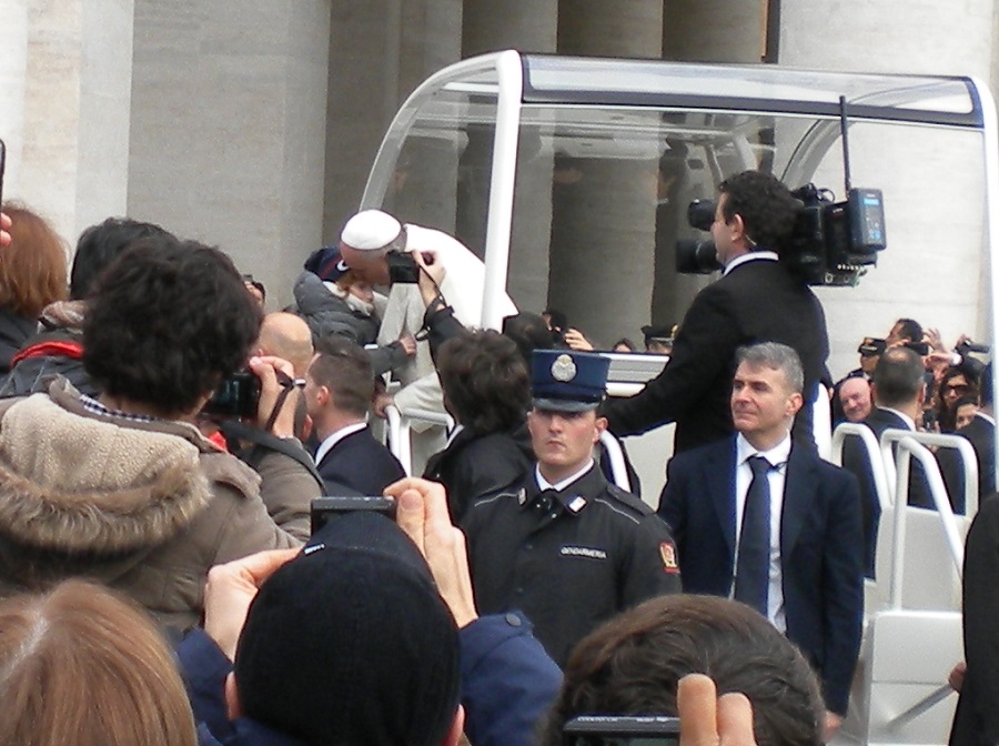 Prima della catechesi Bergoglio, come di consueto, ha fatto un lungo giro della piazza a bordo di una jeep coperta, salutando i fedeli e baciando i bambini.