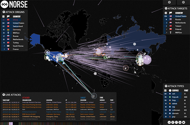 Mashall McLuhan l’aveva predetto già nel lontano 1968: la Terza Guerra Mondiale sarebbe stata una «guerriglia delle informazioni». E guardando la Norse Attack Map non si può che dargli ragione. La NAM è una mappa consente di visualizzare globalmente, e in tempo reale, i cyber-attacchi scagliati ogni giorno e identifica quali Paesi li sferrano e quali sono i loro obiettivi.