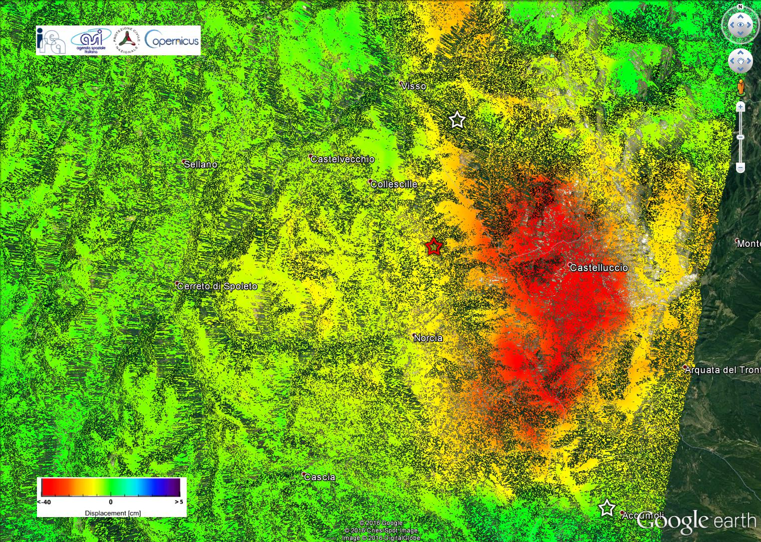 “Dall’interferogramma ottenuto dai dati Sentinel-1 (figura allegata) è possibile delimitare la zona (40 x 15 km) in cui il terreno si è abbassato a seguito dei terremoti del 26 e 30 ottobre di magnitudo 5.9 e 6.5”, dichiara Stefano Salvi, dirigente tecnologo INGV. “Si nota molto bene la complessità dei movimenti del suolo, sostanzialmente dovuti a due categorie di effetti: allo scorrimento degli opposti lembi di crosta terrestre lungo i piani di faglia profondi è dovuto l’andamento concentrico delle frange colorate (linee di uguale abbassamento), mentre discontinuità, addensamenti o piegature ad angolo acuto delle frange sono dovute a fenomeni molto superficiali quali scarpate di faglia, riattivazioni di frane, sprofondamenti carsici. È il contributo dei terremoti alla costruzione dei paesaggi Appenninici”.