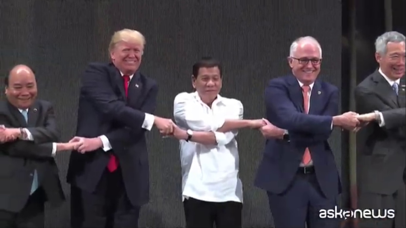 Al via a Manila, nelle Filippine, il summit dell’Associazione dei paesi del Sudest asiatico (Asean). Lunedì e martedì a Manila ospitano due separati summit. Oltre ai paesi Asean, sono invitati anche Cina, Giappone, Russia, Corea del Sud, India, Canada, Australia e Nuova Zelanda. Originale stretta di mani tra i leader dei paesi ospiti alla cerimonia ufficiale.