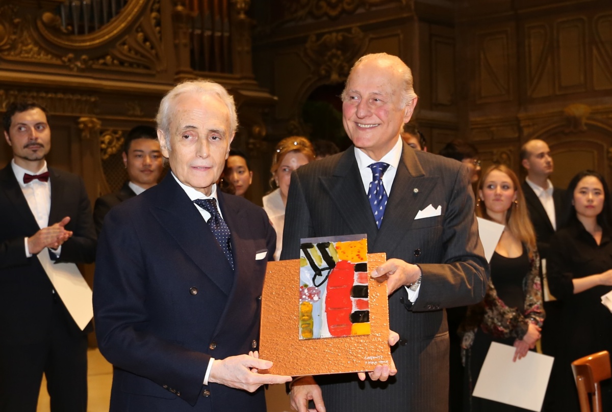 (Nella foto: Giorgio Girelli, presidente del Conservatorio statale Rossini, premia il tenore Josè Carreras)