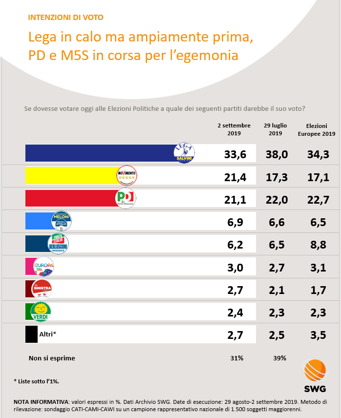 Cresce il Movimento 5 Stelle (21,4%) che recupera una fetta di elettori delusi dall’alleanza con il Carroccio. Scende invece, seppure lievemente, il Partito Democratico tornando ad essere terza forza politica (21,1%). Un quadro sempre più ingarbugliato, ma già dalle prime settimane del Conte bis arriveranno importanti segnali che potrebbero confermare o smentire le principali tendenze nelle intenzioni di voto.
