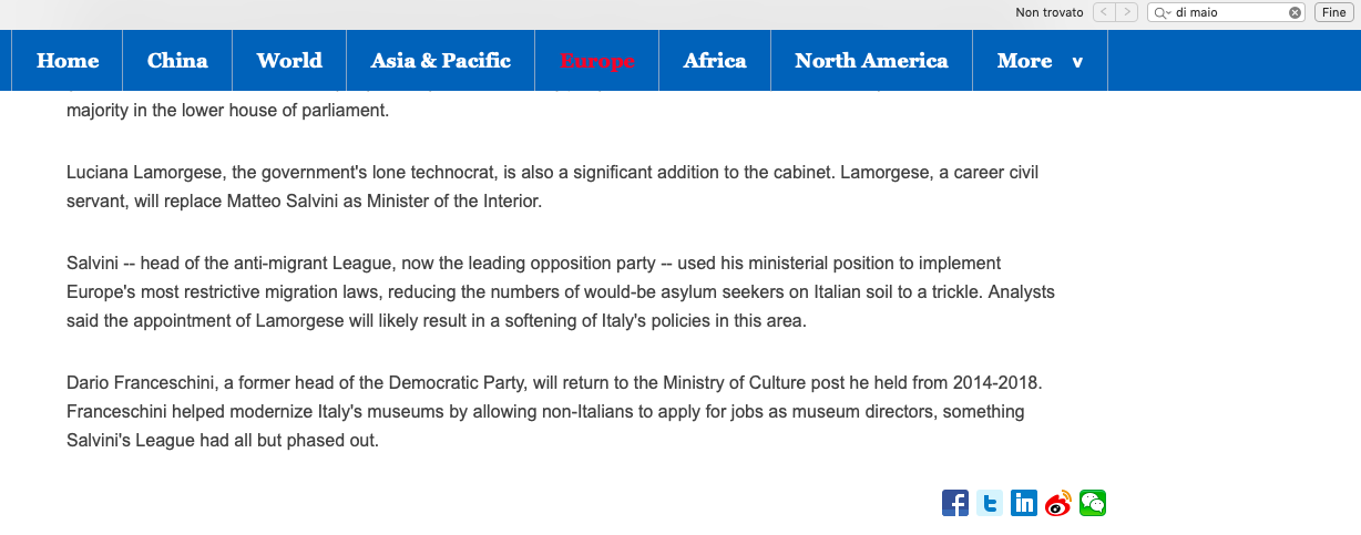Non è chiara la dinamica successiva, ma la Xinhua nel pomeriggio ha rimosso l’intero paragrafo. Ossia, al momento della stesura di questo pezzo, l’articolo resta online con la descrizione dei vari ministri e l’analisi del nuovo governo Conte, ma manca il passaggio su Di Maio. Completamente. Perché?