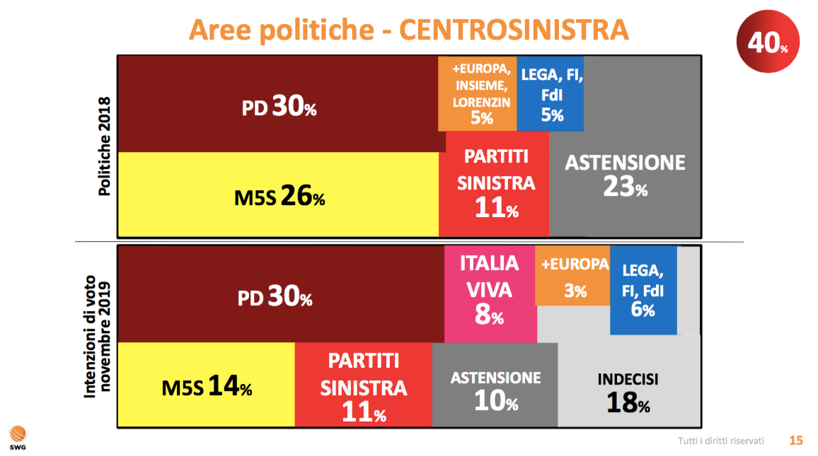 Crollano anche qui i Cinque Stelle, dimezzando quasi i consensi (dal 26% al 14% in un anno), complice probabilmente l’alleanza indigesta con Salvini. Fa inoltre la sua comparsa Italia viva di Matteo Renzi che raccoglie l’8% dei consensi. C’è poi un 18% di elettori indecisi e perfino un 6% di delusi pronti a votare per le forze del campo avverso.