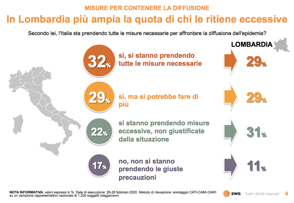 Il dato più sorprendente però è un altro: proprio in Lombardia, la regione più colpita dall’infezione, cresce la percentuale di quelli convinti che le disposizioni siano esagerate (31%). In sostanza, quelli che stanno sperimentando sulla propria pelle gli effetti dei provvedimenti sono quelli che più di tutti li giudicano sproporzionati.