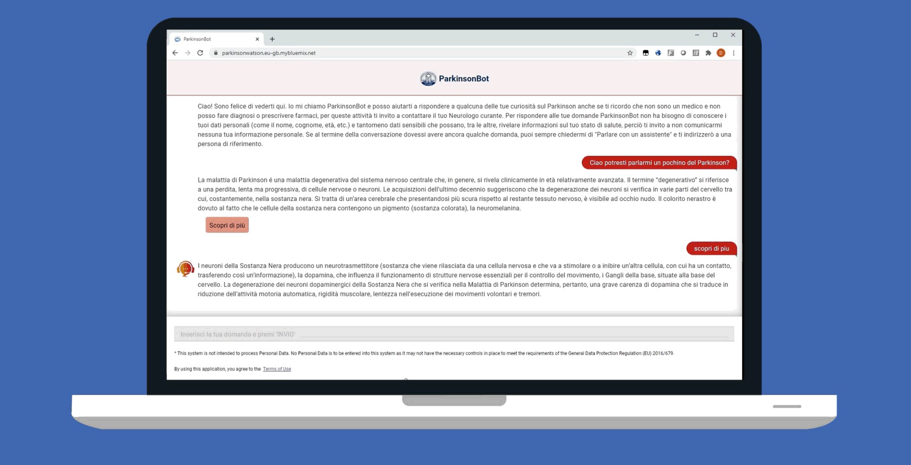 Un robot in grado di rispondere a qualunque domanda sul Parkinson. Sette giorni su sette. Ventiquattro ore su ventiquattro. Può sembrare lo scenario di un film distopico o, con meno fantasia, un progetto sul futuro della telemedicina. Invece esiste già e si chiama Parkinson bot. Si tratta di una delle prime soluzioni tecnologiche in Italia in grado di ottimizzare l’accesso alle informazioni sul Parkinson per le persone affette dalla malattia neurodegenerativa. In sostanza, grazie a un consulente virtuale abilitato da Ibm Watson Assistant su public cloud Ibm, sarà possibile porre domande sul morbo di Parkinson in linguaggio colloquiale, consentendo dunque un approccio semplice e snello a portata di tutti i pazienti.