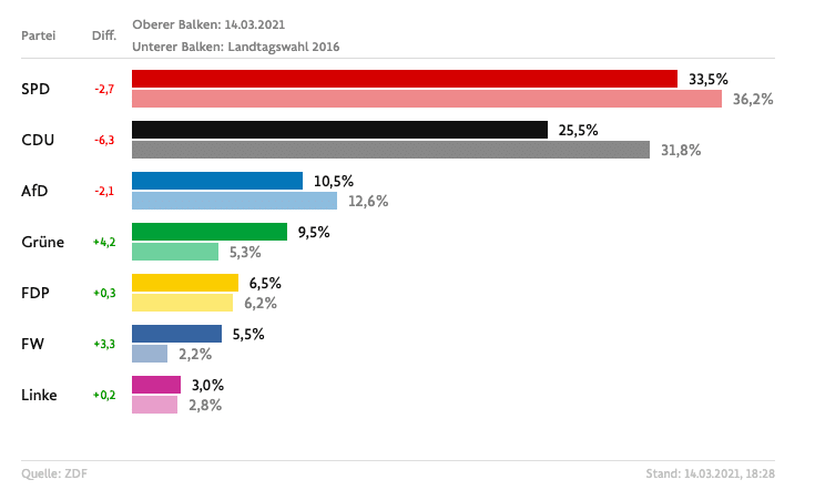 In Renania-Palatinato la Cdu fino a qualche settimana fa avrebbe avuto buone speranze nel sostituire la governatrice Malu Dreyer ma lo sprint finale del candidato cristiano-democratico Christian Baldauf è stato messo in ombra dal caso delle mascherine. E l’ha pagata cara: tra i due partiti che governano insieme nel Bundestag c’è in questo caso una differenza di 8 punti percentuali.