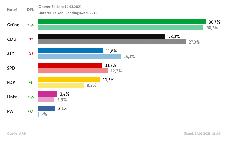Le elezioni nei Länder Renania-Palatinato e Baden-Württemberg, come abbiamo già spiegato nei giorni scorsi, erano una data importante principalmente per la Cdu di Laschet, nuovo leader di partito che si trovava a fronteggiare la prima tornata elettorale segnata dallo scandalo mascherine. Secondo i primi exit poll in entrambi i Länder il partito cristiano-democratico arriva in seconda posizione ma registra un forte calo: nel Baden-Württemberg sono in vantaggio i Verdi mentre in Renania-Palatinato i social-democratici. Il crollo della Cdu è chiaro in entrambi i Länder.