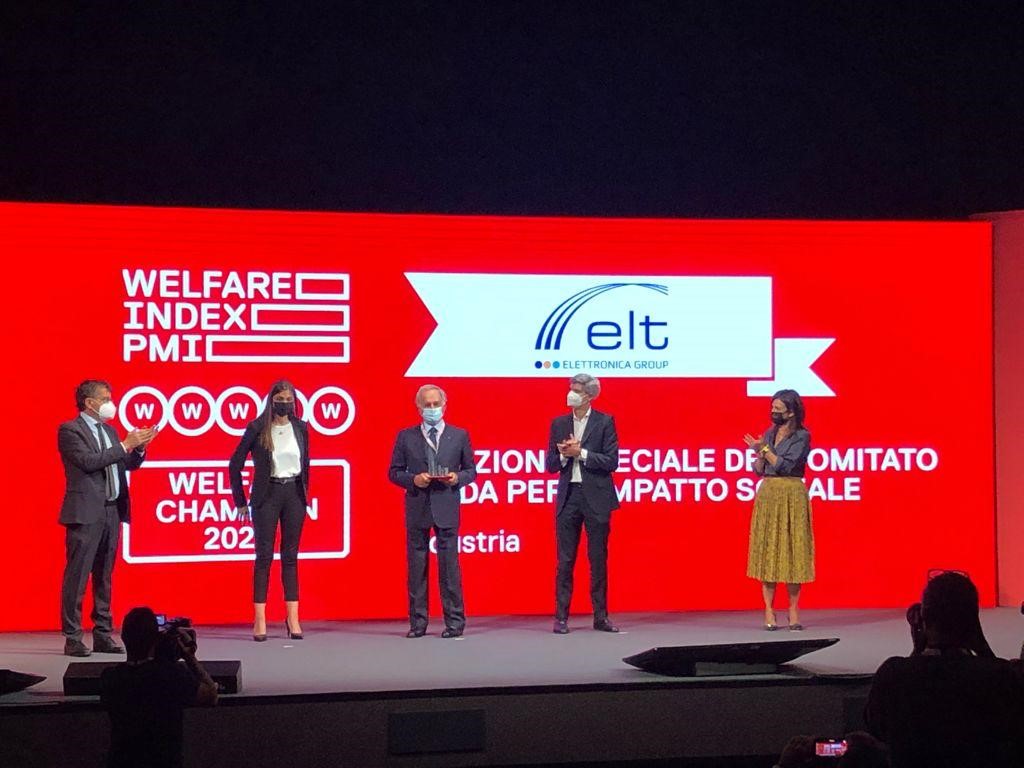 Elettronica riceve per la seconda volta il primo posto assoluto nella classifica Welfare index Pmi 2021, la classifica che premia le aziende “Welfare champion” che si sono distinte nelle politiche di benessere aziendale andando incontro ai bisogni dei dipendenti. L’azienda ha ricevuto anche la menzione speciale del Comitato guida per l’impatto sociale