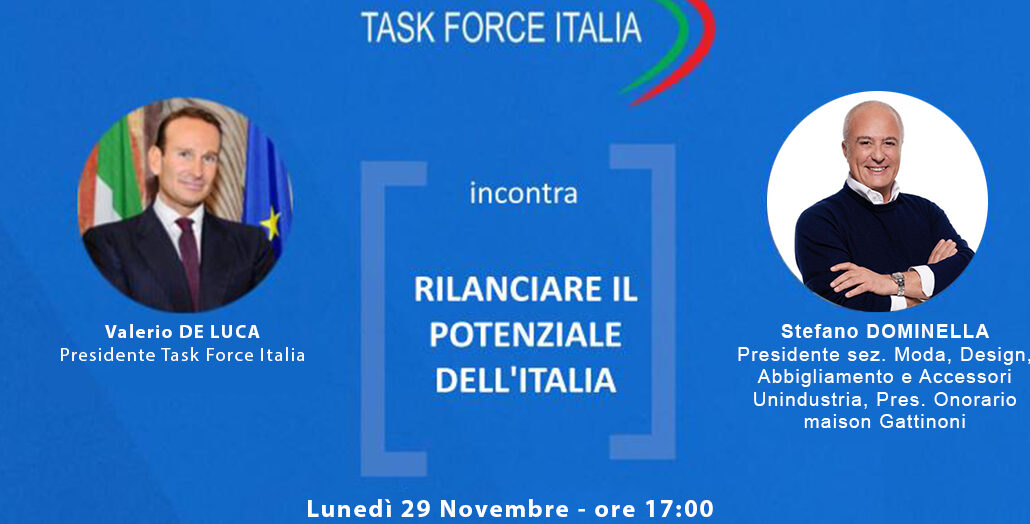 La filiera della moda rappresenta un settore strategico per il rilancio dell’Italia nel mondo e necessita di un piano articolato di policy per creare valore sostenibile nel lungo termine e innovazione nei modelli di business. Nuovo appuntamento con il web talk “Rilanciare il potenziale dell’Italia” che lunedì 29 novembre alle ore 17:00 ospiterà Stefano Dominella, presidente della sezione Moda, design, abbigliamento e accessori di Unindustria; nonché presidente onorario della Maison Gattinoni nel corso di un’intervista con Valerio De Luca, presidente di Task Force Italia