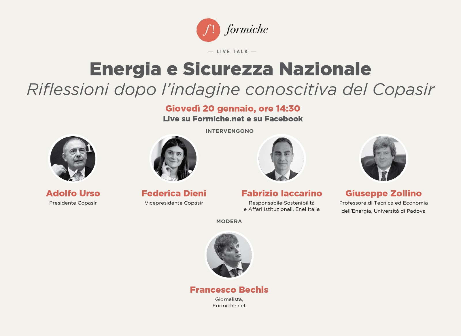 “Energia e sicurezza nazionale. Riflessioni dopo l’indagine conoscitiva del Copasir”. Giovedì 20 alle h. 14.30 LIVE sulla pagina Facebook di Formiche e su Formiche.net un dibattito sulla sicurezza energetica italiana alla luce dell’alert del Copasir. Con Adolfo Urso, Federica Dieni, Fabrizio Iaccarino e Giuseppe Zollino