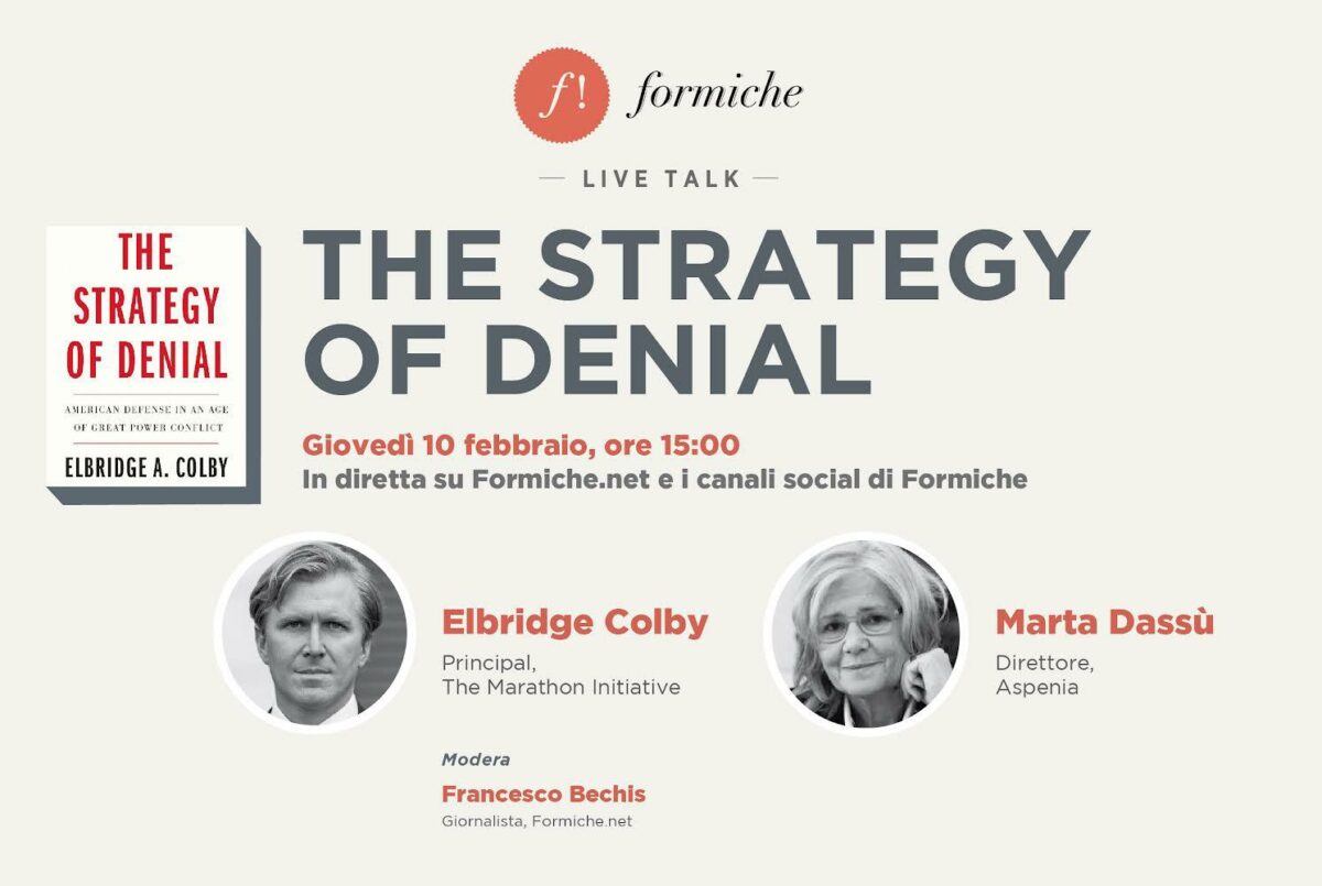 Giovedì 10 febbraio, alle h. 15.00 LIVE su Formiche.net e sulla pagina Facebook di Formiche, la presentazione di “The Strategy of Denial” (Yale University Press), l’ultimo libro di Elbridge Colby, analista americano e presidente della Marathon Initiative, già sottosegretario alla Difesa dell’amministrazione Trump e tra i più noti strateghi americani.