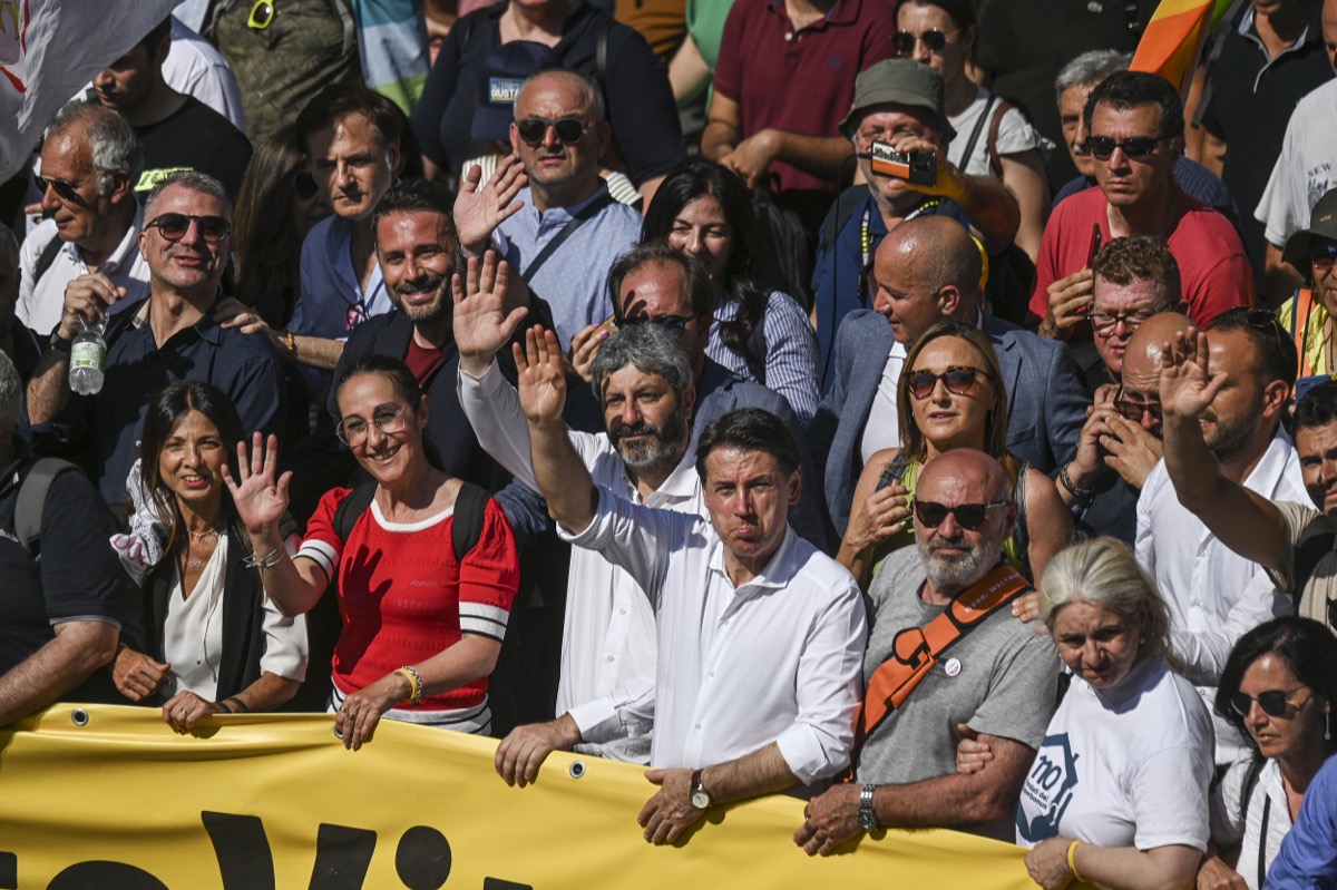 Paola Taverna, Roberto Fico, Giuseppe Conte, alla manifestazione “Basta vite precarie” del Movimento 5 Stelle (17/06/2023, Roma, Imagoeconomica)