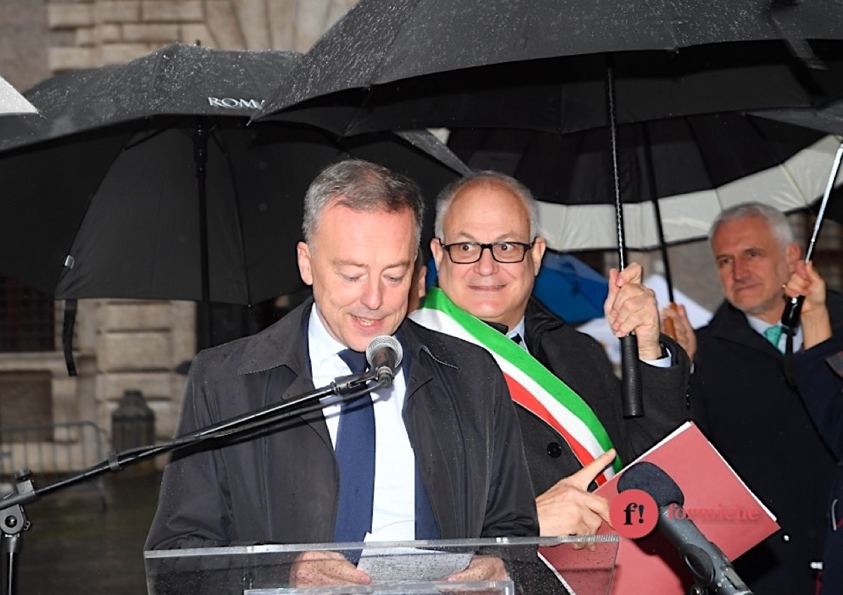 Martin Briens e Roberto Gualtieri all’inaugurazione della facciata di Palazzo Farnese e delle fontane di piazza Farnese restaurate (09/12/2024, Roma, Umberto Pizzi)