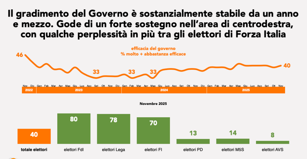 C’è un’Italia che non si “scalda” più, ma che resta ferma sulle sue posizioni. L’ultimo Radar Swg fotografa un governo Meloni che, pur non brillando per entusiasmo popolare, resiste a livelli di consenso eccezionalmente stabili: il 40% degli italiani continua a giudicarlo “abbastanza efficace”, una quota che da diciotto mesi non si muove di un punto.