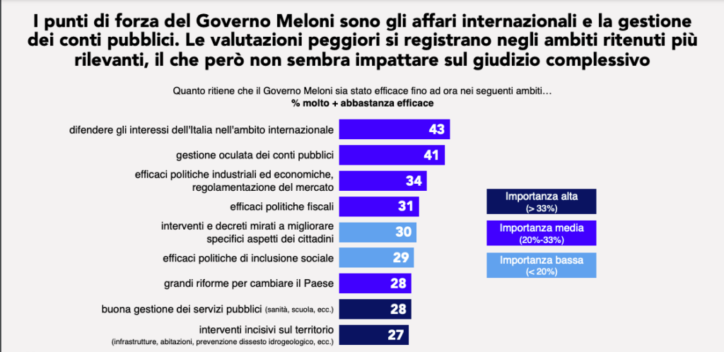 Nel merito delle politiche, emerge un paradosso: i cittadini chiedono soprattutto efficienza nei servizi pubblici e interventi sul territorio – due ambiti in cui il governo raccoglie i voti più bassi. Sanità, scuola e infrastrutture restano il tallone d’Achille dell’esecutivo. Al contrario, le maggiori valutazioni positive arrivano sulla politica estera e la gestione dei conti pubblici: settori di importanza media, ma dove Meloni incassa il riconoscimento di “buon governo”. È la conferma che il capitale politico della premier si gioca più sull’immagine internazionale e sulla disciplina dei conti che sull’efficacia domestica.