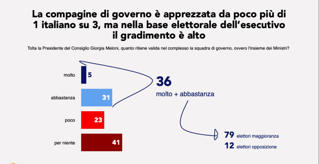 Anche la squadra di governo – esclusa Meloni – raccoglie il favore di poco più di un terzo degli italiani, ma nell’elettorato di maggioranza il gradimento sale a livelli plebiscitari (79%). Un dato che racconta più la fede politica che la convinzione nella qualità dell’esecutivo.