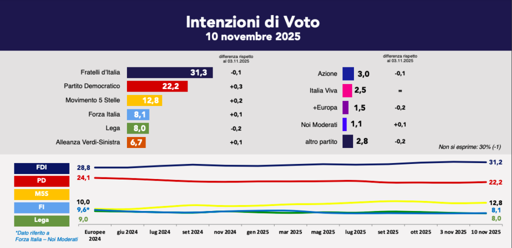 Sul piano elettorale, la fotografia del 10 novembre 2025 conferma una tenuta del centrodestra, ma con segnali di raffreddamento. Fratelli d’Italia resta primo partito con il 31,3% (-0,1 rispetto alla settimana precedente), seguito dal Partito Democratico al 22,2% (+0,3) e dal Movimento 5 Stelle al 12,8% (+0,2). Forza Italia si attesta all’8,1%, mentre la Lega scende all’8,0% (-0,2). In leggera ripresa l’Alleanza Verdi-Sinistra al 6,7%, mentre Azione e Italia Viva restano ai margini (rispettivamente 3% e 2,5%).