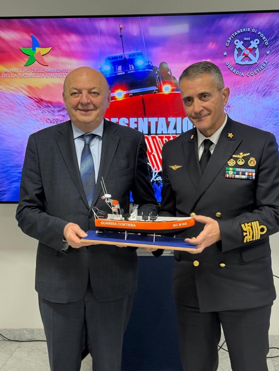 Gilberto Pichetto con il comandante generale delle Capitanerie di Porto Ammiraglio Sergio Liardo per la consegna di tre nuovi battelli Bravo (22/01/2026, Fiumicino, Instagram)