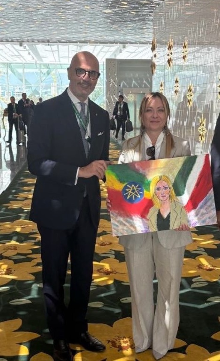 L’ambasciatore d’Italia in Etiopia Sem Fabrizi regala a Giorgia Meloni un ritratto realizzato dagli studenti della scuola italiana di Addis Abeba (16/02/2026, Addis Abeba, Linkedin)