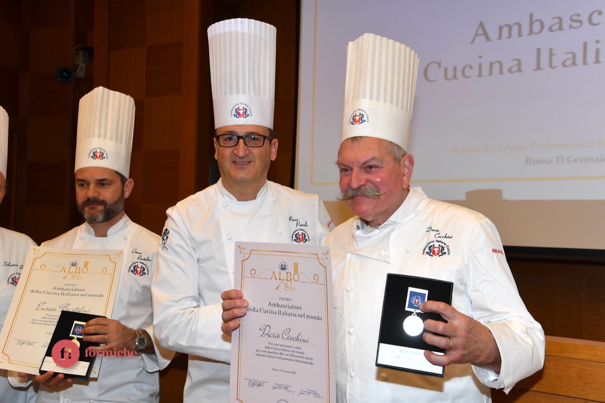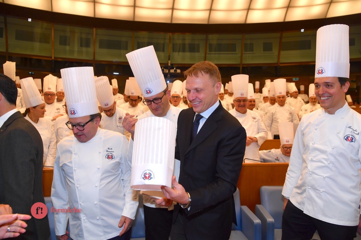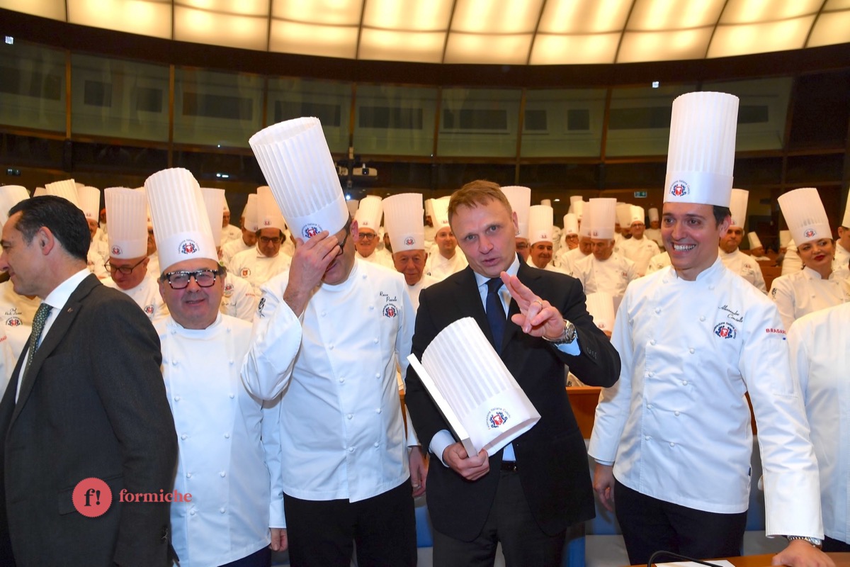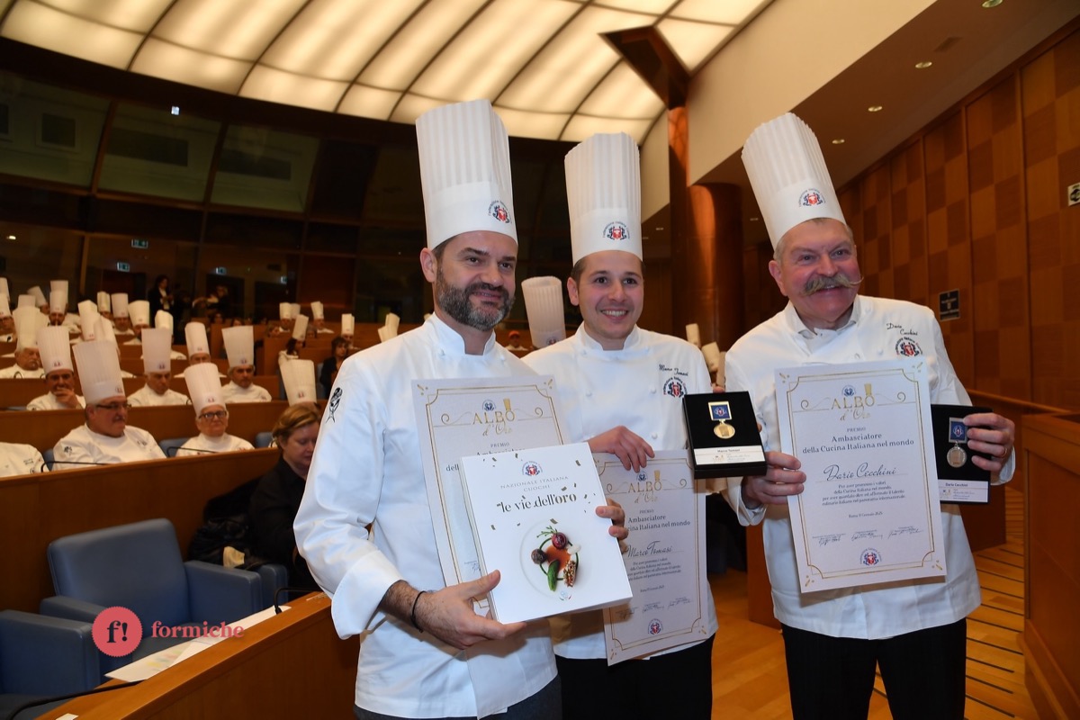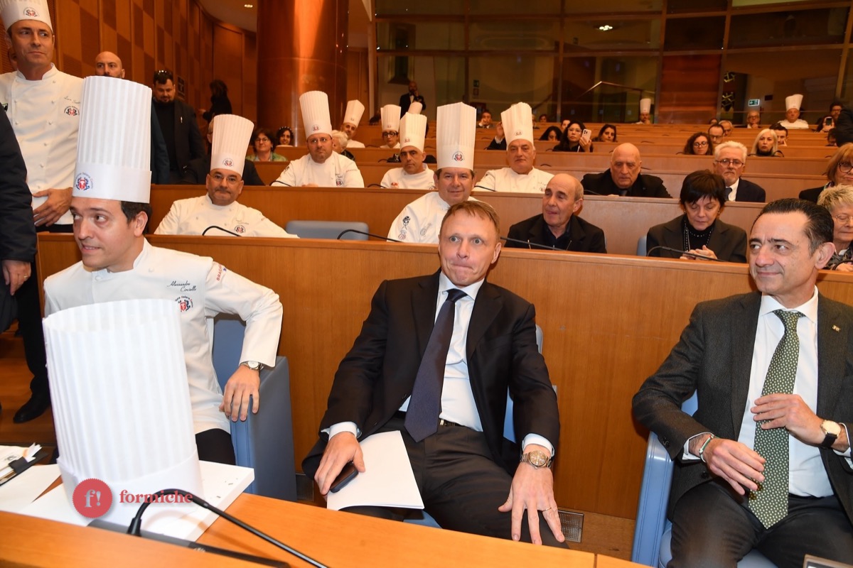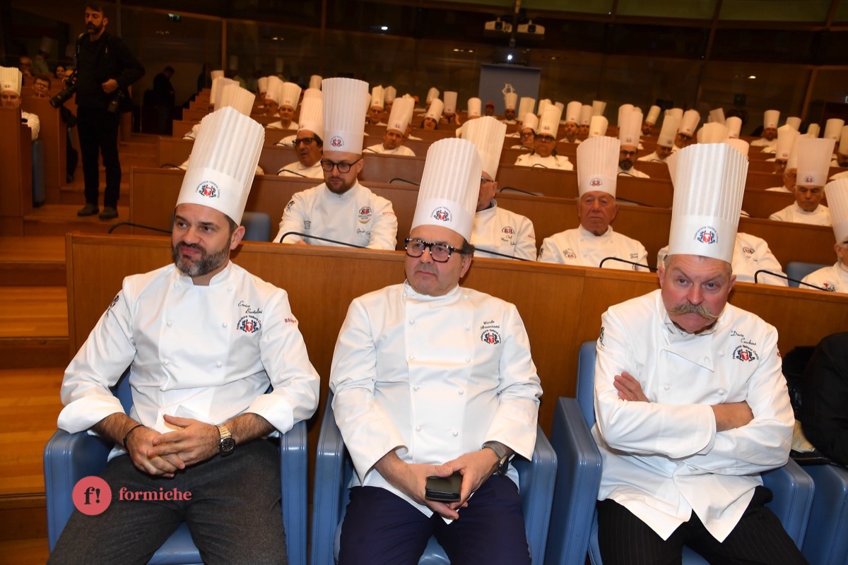 Centinaia di berretti bianchi, provenienti da tutte le regioni d’Italia e da oltre 10 Paesi stranieri, si sono riunite ieri alla Camera dei Deputati per la 2° edizione dell’Albo d’Oro Federcuochi. Il riconoscimento è stato consegnato ad oltre 100 professionisti di varie categorie (Solidarietà e Volontariato, Ambasciatori della cucina italiana nel mondo. L’appuntamento si è aperto con i saluti istituzionali del Questore della Camera Paolo Trancassini, che ha ricordato l’importanza del ruolo dei cuochi per l’Italia, veri ambasciatori del Made in Italy, capaci di raccontare le eccellenze dei nostri territori e le tradizioni più antiche. Il presidente FIC Rocco Pozzulo ha sottolineato l’importanza di “suscitare l’interesse dei giovani verso la ristorazione, settore che richiede impegno e sacrificio ma che può offrire grandi soddisfazioni personali e professionali”.