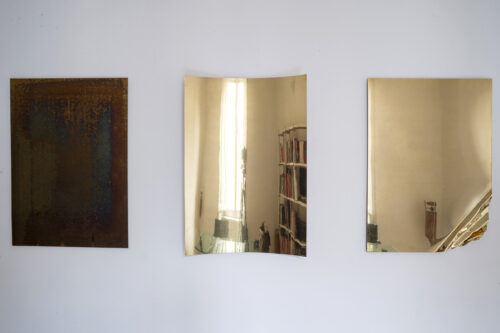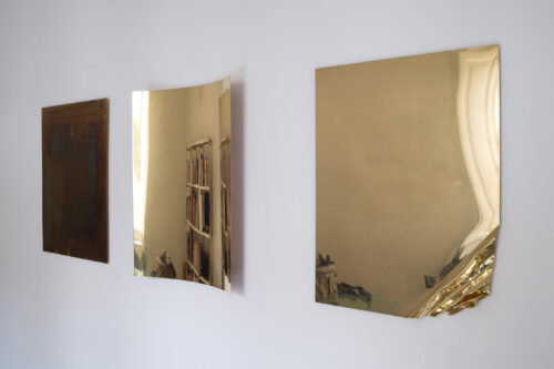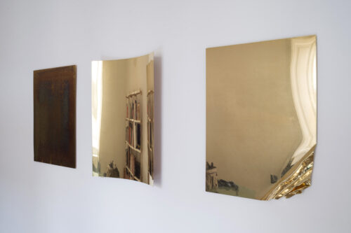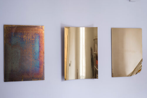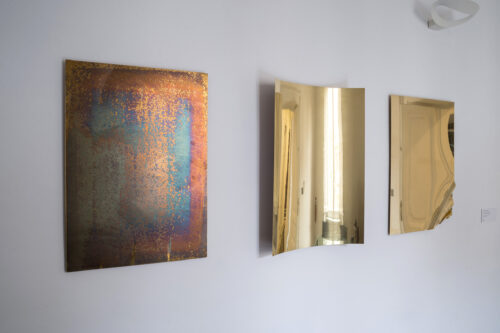 La stessa tecnica è riproposta nel grande dittico che mette a confronto due punti di vista complementari sull’origine dello spazio/tempo: quello della religione e quello della scienza. Così, la Genesi, il primo capitolo della Bibbia, è accostato alle pagine del saggio (The Beginning of the World from the Point of Quantum Theory, 1931) in cui Edouard Georges Lamaitre, fisico e astronomo belga, ma soprattutto padre gesuita, espone per la prima volta la teoria del big bang, ricondotta a ciò che egli definisce “atomo primitivo”. Opera centrale della mostra sono le tre lastre di ottone di “Pillars of Creation (Time, Space, Gravity)” che compongono una sorta di pala d’altare contemporanea, in cui queste tre dimensioni della realtà e dell’universo vengono declinate in maniera brillante e poetica. Il titolo del lavoro riprende quello della famosa fotografia scattata dal telescopio spaziale Hubble il 1 aprile 1995 alle colonne di gas interstellare nella Nebulosa Aquila. L’opera si ispira inoltre alle placche commemorative poste a bordo delle sonde Pioneer 10 e 11 nel 1972 e nel 1973: insieme alle immagini di un uomo e di una donna, sulle placche erano presenti i simboli con le informazioni fondamentali sul mondo di provenienza. Tra gli estremi dell’origine e della proiezione nel futuro si muove questa riflessione condotta in forma espositiva.