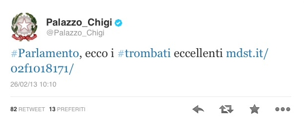 Fini, Ingroia, Di Pietro e altri ancora. Ecco i “trombati eccellenti" secondo l’account Twitter ufficiale di Palazzo Chigi che questa mattina si è lasciato scappare (?) un tweet che sta facendo discutere molto in Rete: “Parlamento, ecco i trombati eccellenti”. E a seguire un link ad una photogallery di TgCom24, con le foto di 15 volti politici noti. Il tweet,…