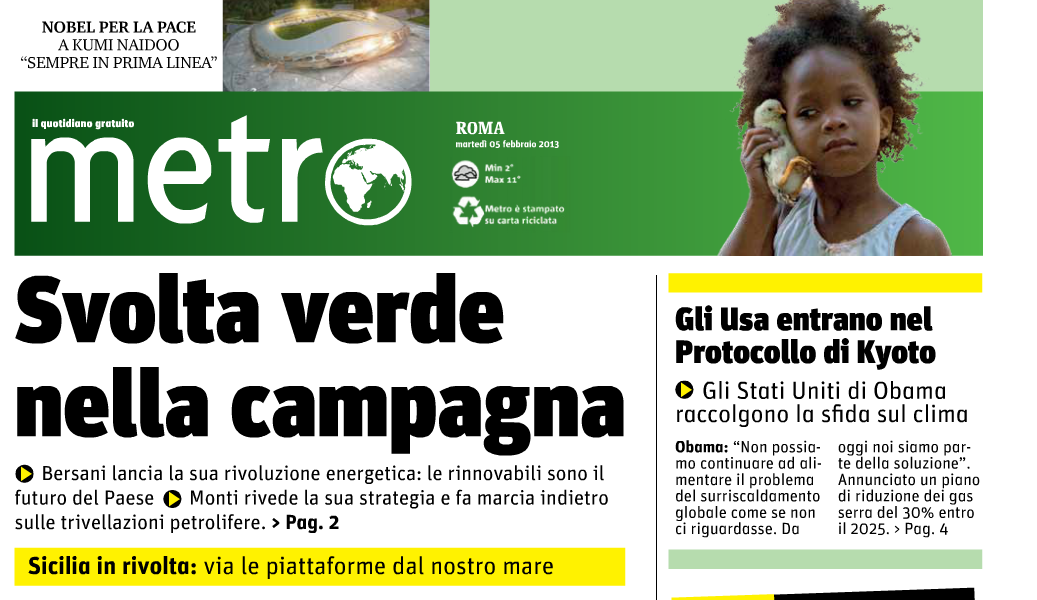 La svolta verde della campagna elettorale, gli Usa di Obama che raccolgono la sfida dei cambiamenti climatici, la Cina che abbandona le fonti fossili, i cittadini e gli amministratori siciliani in rivolta contro le trivelle petrolifere al largo delle loro coste, l’istituzione di un Tribunale Internazionale per l’Ambiente, un mega parco eolico inaugurato a Taranto, novità sull'Imu già da questo…
